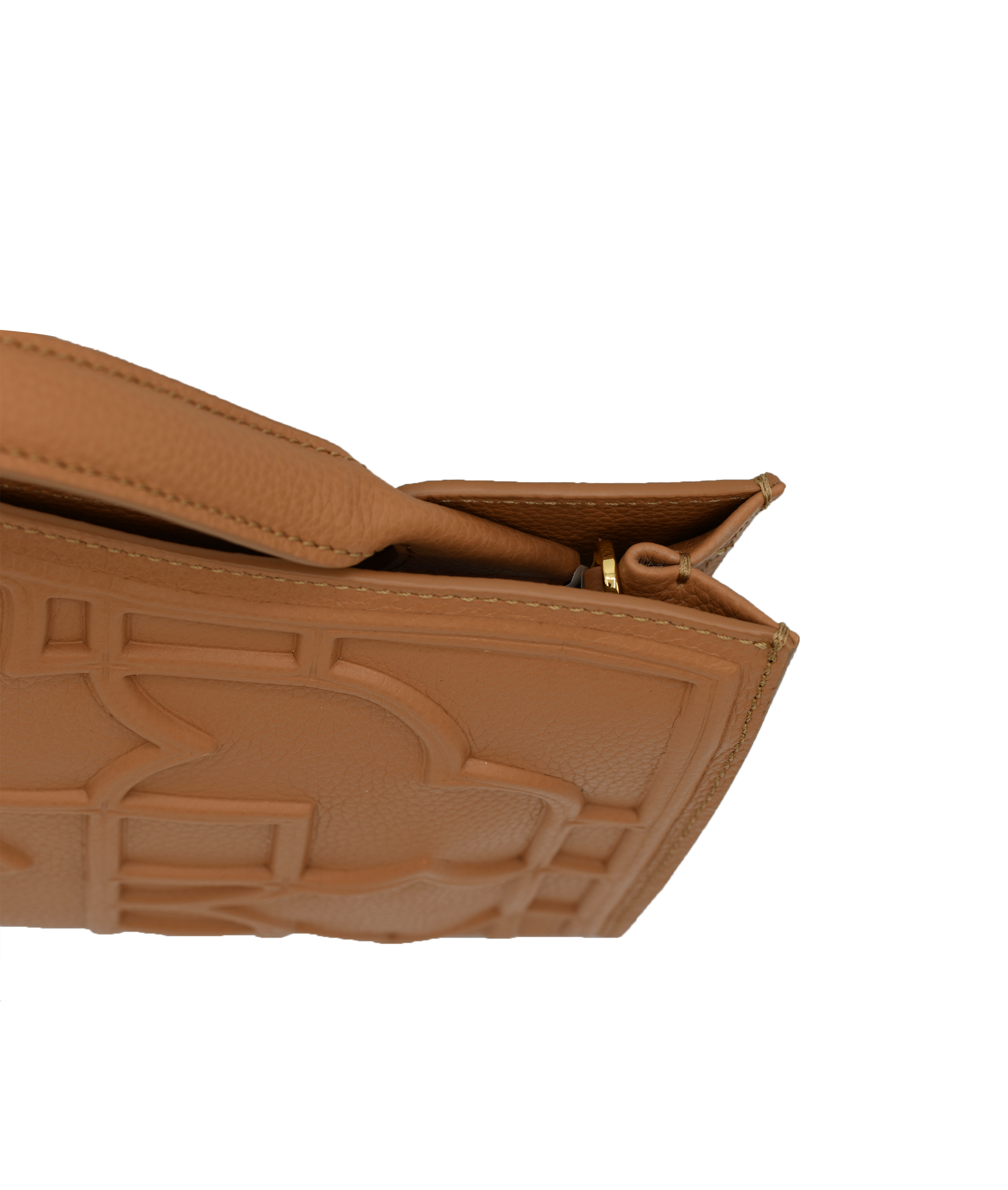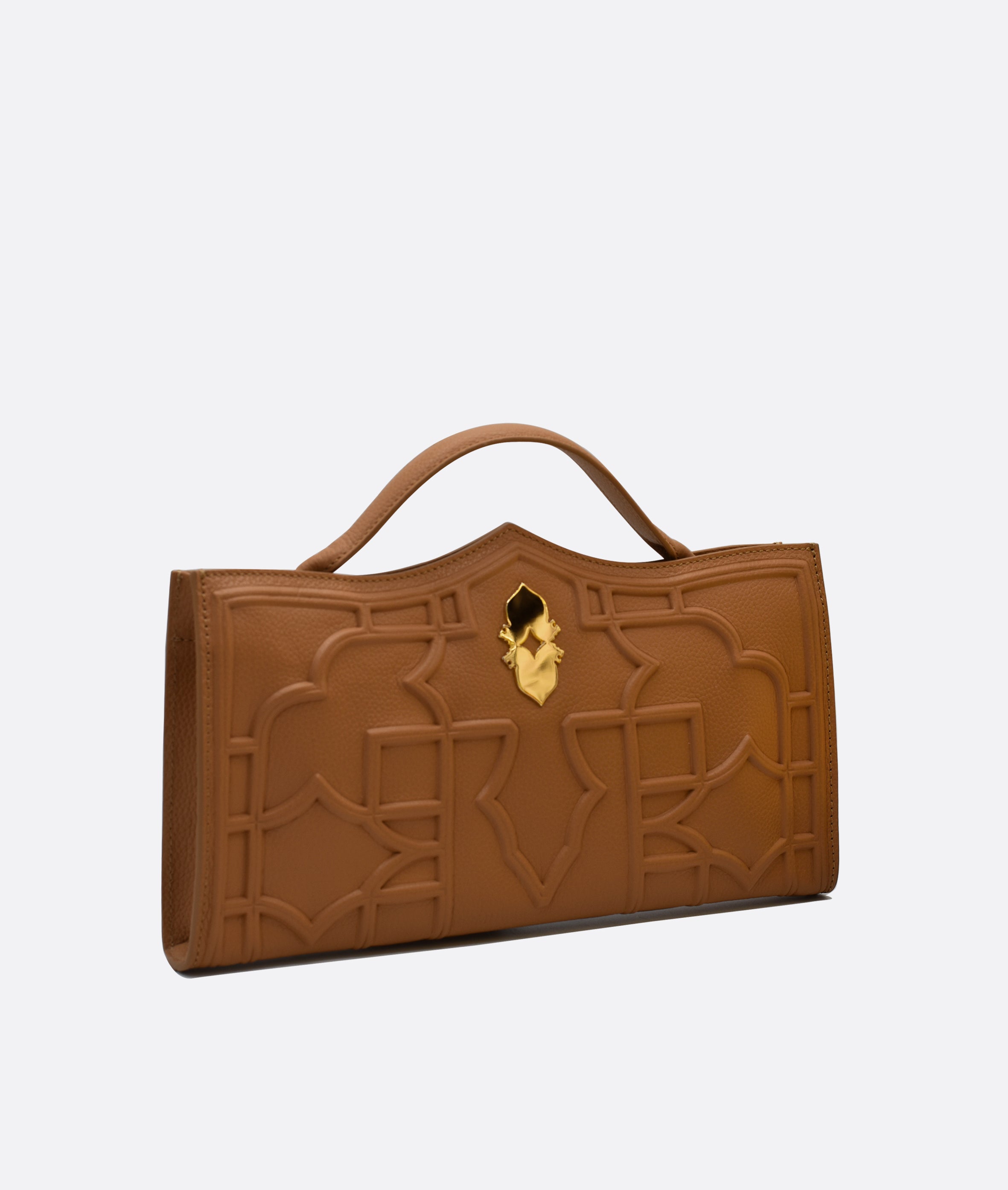 Verna clutch bag in premium calfskin leather, handcrafted in Venice. Features 18k gold-plated 'Leone e Stella' logo and embossed geometric pattern inspired by Venetian architecture.